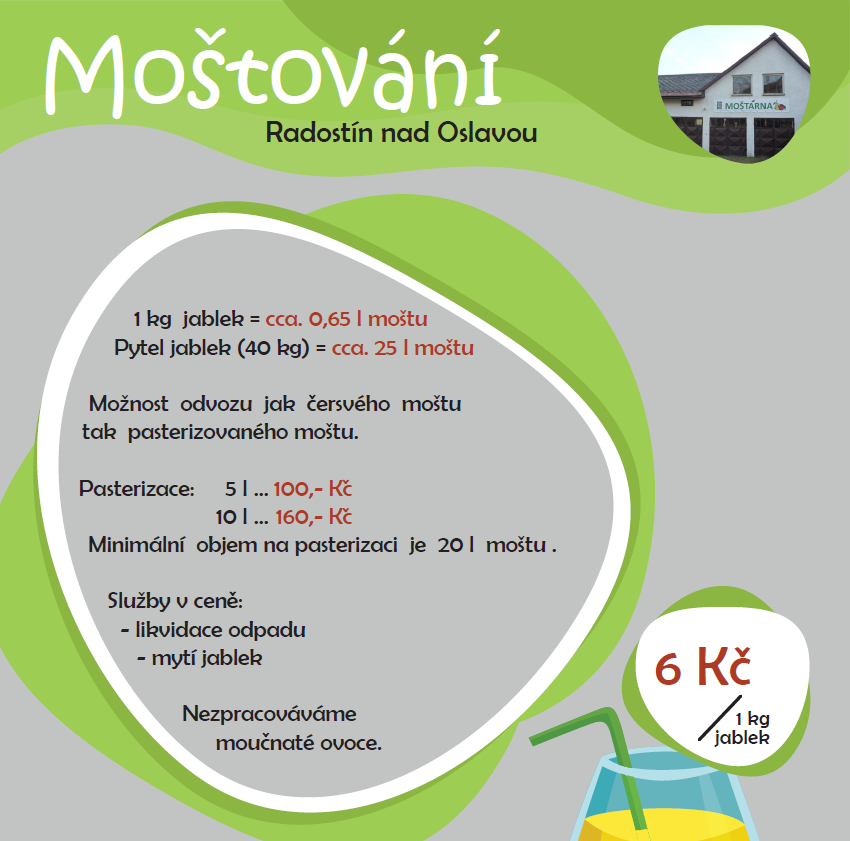 Pokud SI PŘEJE čerstvý mošt - obchází budovu, do moštárny vstupuje zadním vchodem a stáčí si svůj mošt do vlastních nádob. Poté ODJÍŽDÍ dolní branou. Pokud i